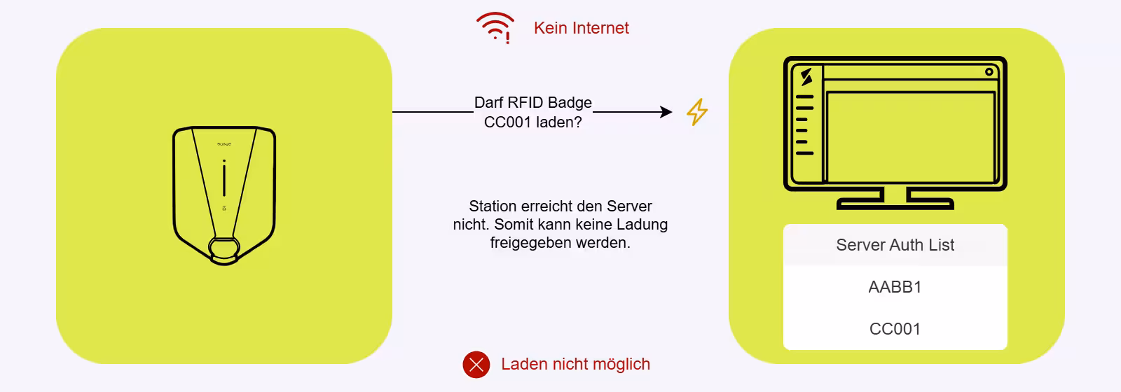Kann die Ladestation den Server nicht erreichen, kann sie nicht prüfen, ob ein Badge laden darf. Im abrechnungssicheren Modus bedeutet das: Laden nicht möglich.
